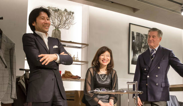 左から田窪さん、エッセイストの中野香織さん、ハケット ロンドンのジェレミー・ハケットさん。英国展期間中の11月4日に伊勢丹新宿店 メンズ館8階  レジデンス「THE GALLERY by CHALIE VICE」で、英国紳士に精通する3人が登壇した、ひと夜かぎりのトークイベントが開かれた<br><br>Photograph by FUJII Taku
