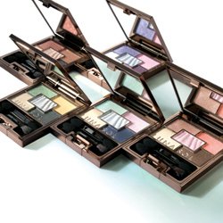 「オーロライズニュアンスアイズ」は、光を受けてさまざまに輝くオーロライズパールと純銀を贅たくに使用した、限定の単色アイシャドウ。しっとりとした感触で、目もとに輝きとニュアンスをあたえ、幻想的なまなざしを完成させる。グリーン、ピンク、イエローは、単色でも、ほかのアイシャドウに重ねてもOKの“使える色”。いつでも気軽に、オーロラメイクが楽しめる。