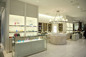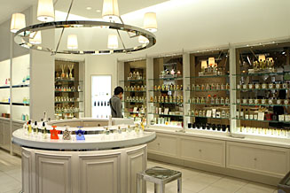 2007年2月より中央エスカレーターそばに移転し、より見やすく、落ち着ける、洗練された空間に生まれ変わったフレグランスコーナー。店内にはおよそ30ブランドの製品が美しく並び、中央には円形のフレグランス バーも設置。リッチな気分でさまざまな香りを試すことができる。