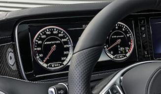 Dシェイプデザインのあたらしい3スポーク AMGスポーツステアリングは、アルミシフトパドルや、エアコンのエアアウトレットとのデザイン的なコーディネートを実施。高解像度TFTカラーディスプレイを2枚繋げたメーターパネルは、「S クラス」などと同様だが、メーター部分のデザインは、AMGのオリジナルである。アニメーション化された丸いダイヤル付きのレッドとシルバーのレタリングや針が特徴的なAMGメーターパネルは、エンジン起動のさい330km/hスケールのスピードメーター内にAMGのロゴが、タコメーター内に「V8 BITURBO」のレタリングが表示される。
