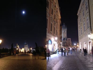 暗い夜道を地図頼りに駅から10分ほど歩いて歴史地区内にあるホテルへ。さっきの駅が想像もつかぬほどきれいな夜景が続く。カレル橋の上には満月。