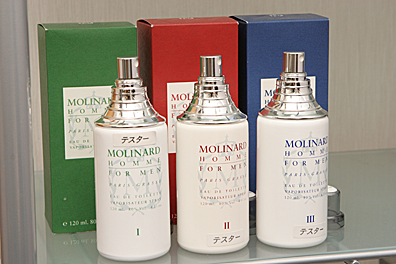 吉岡:えぇ、これも弊社で取り扱っている「モリナール オム」という大人の男性向けのメンズフレグランスですが、1から3まで3つの香りに分かれているんですね。それで、日本で売るために、1はプロヴァンスのラベンダーをトップノートにした天然植物の香りで「仕事」用、2は女性好みのウッディ調で「アフターファイブ」、3はタラゴンというハーブや杉の香りをベースに「レジャー、アウトドア」と目的別に設定しました。