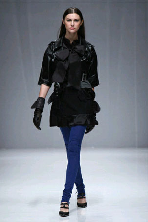 レザーのショート丈ライダースのルックですね。ハードな革を使いながら、デザインで丸みをもたせて、強さと女性らしさをバランスで見せています。