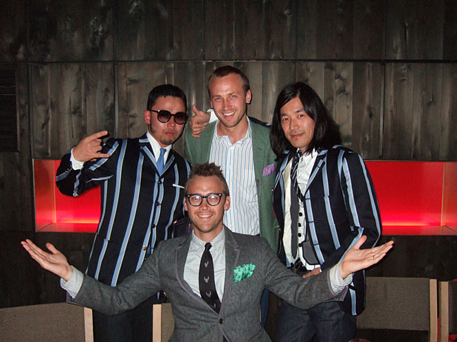 まっ、酒も入り、酔いもほどほどに記念撮影となりました。BARKER BLACKのふたりは、兄弟ならではの息ぴったりな感じですね。僕と小木くんのジャケットはLiquer Woman & TearsがVANに別注したもの。僕はこのストライプが好きです。エンブレムもついていたのですが、シックに着こなしたかったので外しました。