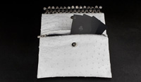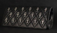 トランプのようなカードを入れて遊びに行くためにつくられた大人のクラッチバッグ。クロムハーツの代表的なクロスモチーフとプラスモチーフで新たに編み上げたチェーンメールをほどこしたエレガントなポーカーケースで、この新作はカーフレザーとオーストリッチを贅たくに使用。
