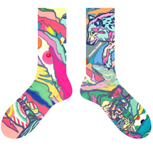生々しさを覚えるほどのイノセンスを、原色で表現したミック・イタヤ氏のイラストレーション、淡いトーンとあたたかみのあるタッチで描かれるソリマチアキラ氏の作品、抽象的なイメージに日本の豊かな自然を織り交ぜているアサクラコウヘイ氏の絵画、すべて、今回のために描き下ろされ、靴下へと落とし込まれた。