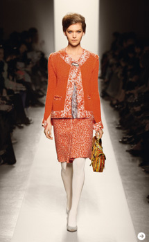 鮮やかなオレンジのコートではじまったボッテガ・ヴェネタはレディライクなコートとスカートのアンサンブルを披露した。ロングチュニックやカーディガンジャケットにプリーツスカートの組み合わせはクラシックだがリアル。ぺたんこシューズが新鮮だ。
