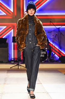 この秋はタータンチェックやウインドウペーンなどクラシック柄が大登場です。チェックと言えばイギリス。ビューティフル・ピープルは“ビートルズ”をテーマに、ユニオンジャックを掲げてメンバーがビートルズ曲を演奏し歌うというキャットウォークです。これはデザイナー、熊切さんのかねてよりの念願だったとか。ダッフルコートやピーコートの下にウールチェックのくるぶしパンツを合わせ、お揃いのストールを巻き付けます。バイカラーのダブルフェイスカシミアコート、ムートンのフード付コートも登場、上品なカジュアルを演出しました。白いソールのカラースニーカーが小気味良い。あったかい気持ちで服と向き合えるコレクションです。