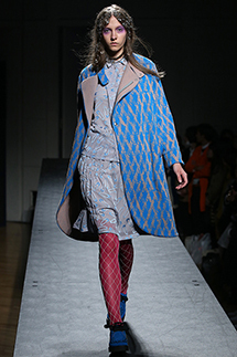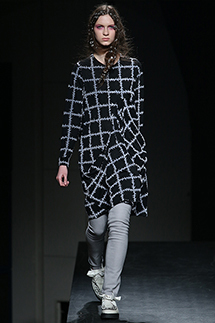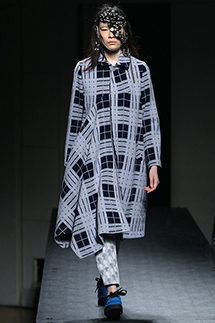 ミントデザインズはいつものような優しさだけではない勢いのあるコレクションです。ジグザクの直線ステージをモデルが闊歩。ウインドウペーンのチェックを斜めに接ぎ、フレアーを流しアシンメトリーのモードなドレスに仕上げています。チェックの中にモチーフを入れたバイカラーのコートが細いパンツと合わせてシャープです。色は黒白中心にブルーや赤が差し色。素材と技にひねりを加え、コレクションの奥行きを添えています。