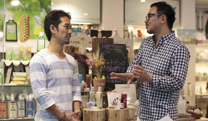 小木充氏に話を聞くモア・トゥリーズ事務局長 水谷伸吉氏(写真左)。コスメキッチン第一号店 代官山店にて