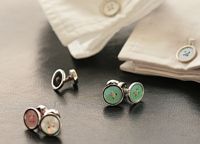カフリンクスだけにボタンモチーフ、というウィットに大人の遊び心を感じるスターリングシルバー×シェルのカフリンクス (2007年春夏コレクションモデル。発売中)。