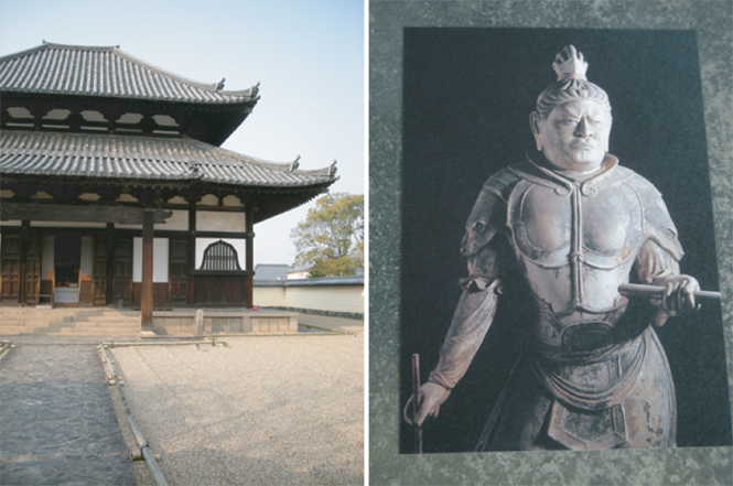 左/東大寺大仏殿の横にありながら、喧噪からはなれた、まさに隠れ家的存在なのが戒壇院。ちかくには幼稚園もあって、時たま聞こえる子供の歓声に、ここは天国!?と思ったり。 右/撮影禁止なので、買った絵葉書で、そのお姿を。ほんといまにも動き出しそうで、息をしているみたいな廣目天像。天平時代に作られ、勿論国宝。まさに感動のお姿です。