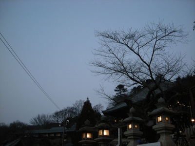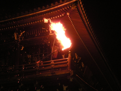 二月堂で待つこと3時間。7時30分に松明がたかれるまでには、美しい夕焼けがあたりを染め悠久の奈良の都を演出(写真上)。で、本番ともなると巨大な松明が11本、急こう配な二月堂を僧侶が駆け抜けます。感動が薄くなったわたしも感激につぐ感激。