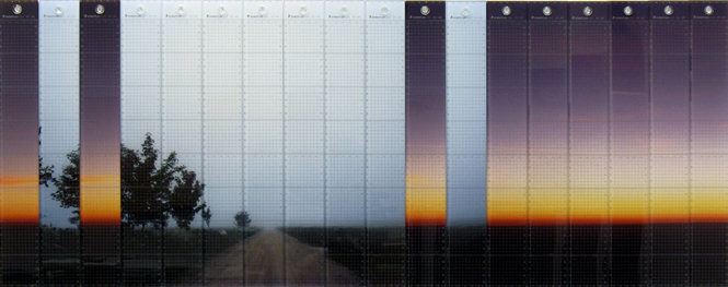 多くのギャラリーが参加した会期中、わたしが最も興味を抱き、そして購入までにいたらせた、この作品は、作家がリトアニアで旅した時に出会った1本の地平線につづく道、並行する木々、それに飛行機内から撮影した真っ赤な夕焼けを、いったん解体分断。そのバラバラになった写真をSTAEDTLERの定規に貼りつけ、そして、それをまた組みなおし編集した、いわばデビット・ホックニー的作品。
