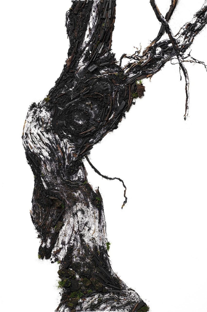 シャンパーニュを生産するために必要な長い過程を知った彼は、その「流れ」に着目。そこからインスピレーションを得て、黒く染めた木片や木炭を使用してブドウの幹を表現する作品を作り上げた。