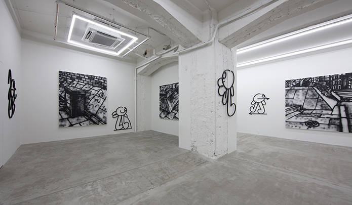 ドローイング作品に加え、新作のスプレーペインティングも展示