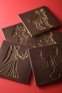 星座を模した12枚のチョコレート「Chocolat Zodiaque(ショコラ・ゾディアック)」は、シェフパティシエのジュリアン・キンツラーが、フランスでとても人気のある星座占いを組み合わせて考案したユニークなチョコレート。