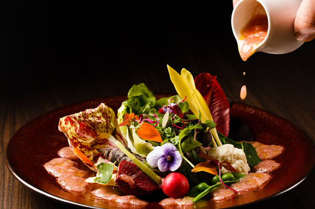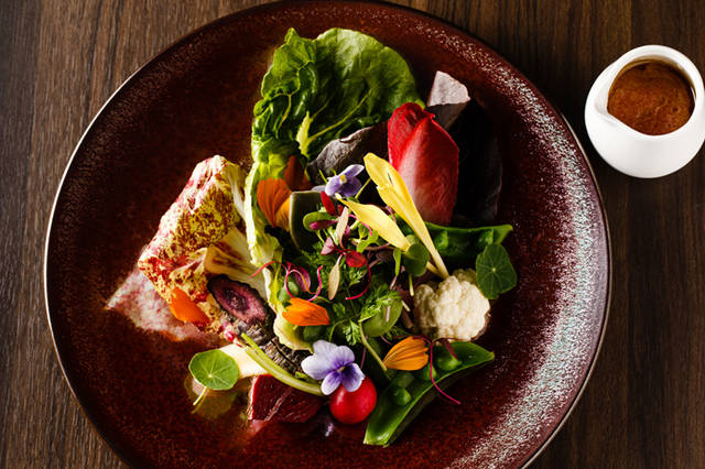 使用される野菜は、有機無農薬・特別栽培の新鮮なもの。安心安全でおいしい野菜を、フレッシュ、炭焼き、ロースト、ピューレ、泡など一弾とおいしくさせる調理法を提案する。またメインの牛肉にもこだわり、国産で安心・安全・高品質の“匠和牛”を使用。そのほかにも、フランス産やニュージーランド産など厳選した豚、鴨、ラム、鹿を新鮮なまま提供する。
