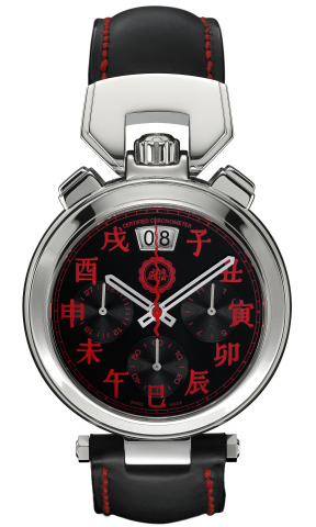 とは言え、最初に目を奪われるのは、文字盤デザインかもしれない。何しろ、ブラックの文字盤は鮮烈なレッドの漢字で埋め尽くされているからだ。これはインデックスを十二支で表しているための意匠だ。このインデックスはかつて中国の皇帝がボヴェの懐中時計を愛用し、中国市場でも好評だったという過去をオマージュしており、実際に19世紀に中国市場で使用していた漢字のブランド・ロゴ「威播」(右から左にボヴェと読む)も記されている。ブラックのカーフベルトは内側をラバーコートしてフィット感を高めるほか、レッドのステッチをあしらうことで、文字盤のカラーリングと完璧な調和を保つ。さらに、1時位置にリセットボタン、11時位置にスタート/ストップボタンというレイアウトは、過去の懐中クロノグラフのアレンジメントそのままであり、これもコレクター心をくすぐる要素だ。