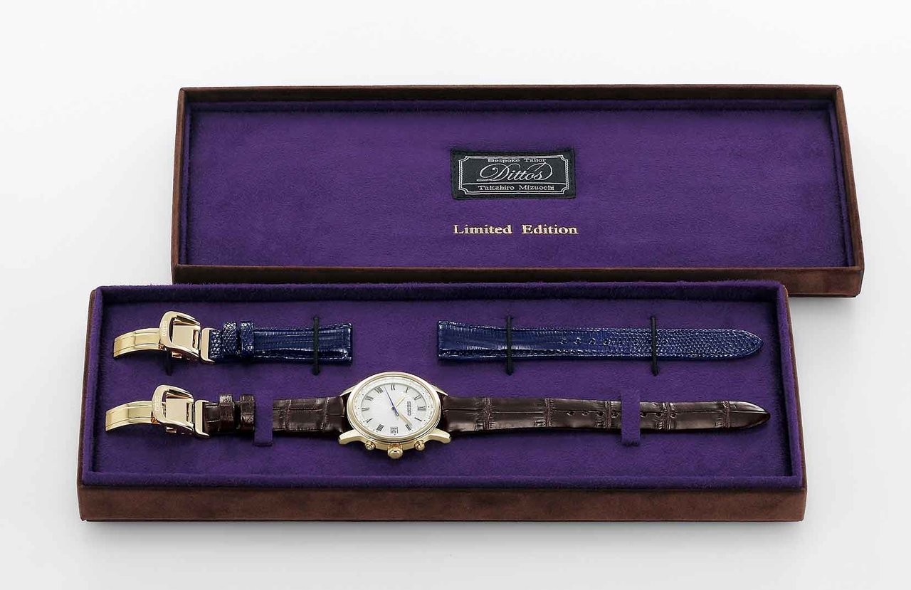 ストラップはベーシックなカラーに加え、カジュアルなシーンに映える艶のある鮮やかなリザード革も付属され、スタイリングに合わせて交換が可能だ。専用ボックスには、「Bespoke Tailor Dittos.」のネームが縫製によって取り付けられ、コラボレーションの世界観を際立たせている。