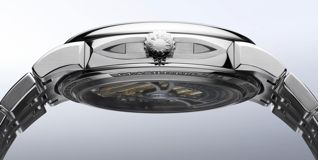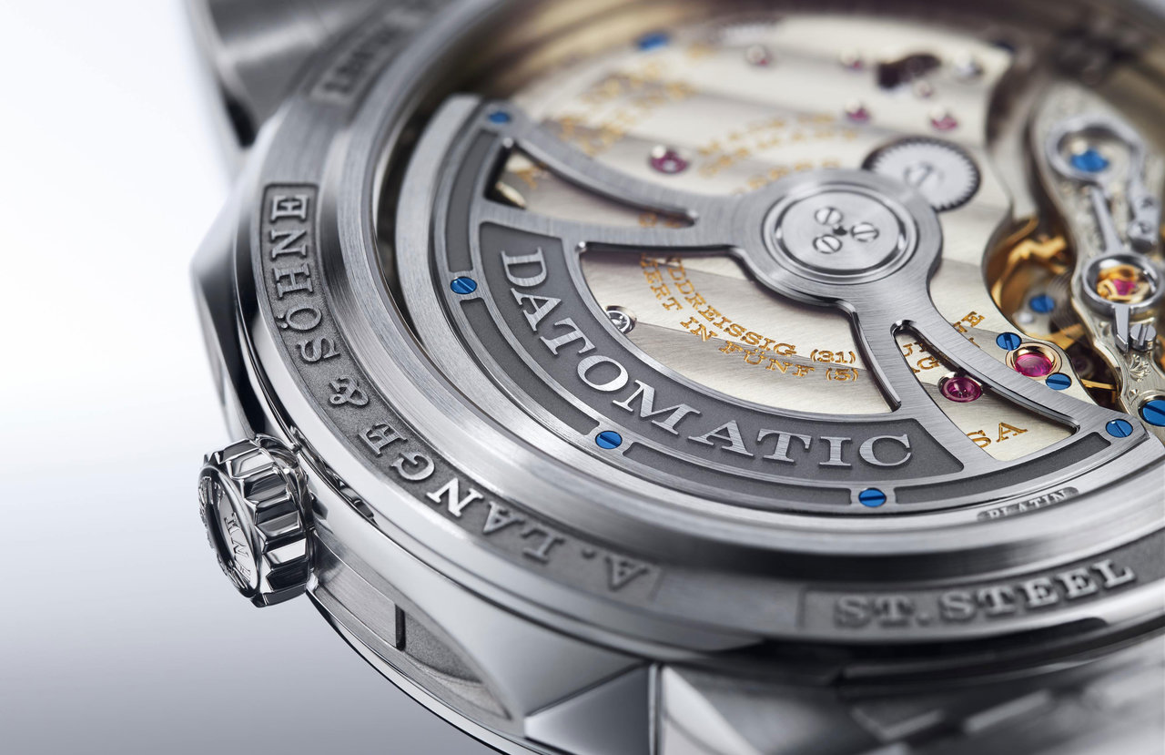 ランゲの慣例に従い、このファミリーのためにムーブメントも新たに開発された。新しいキャリバーL155.1 DATOMATICは、日付機構と自動巻き機構の組み合わせを意味し、サファイアクリスタルのシースルーバックから、ケース内部を占領する直径32.9ミリのムーブメントを鑑賞できる。
